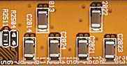 (图为华硕P4T533主板CPU插槽附近C打头的六个陶瓷电容,左侧R打头的为帖片电阻)